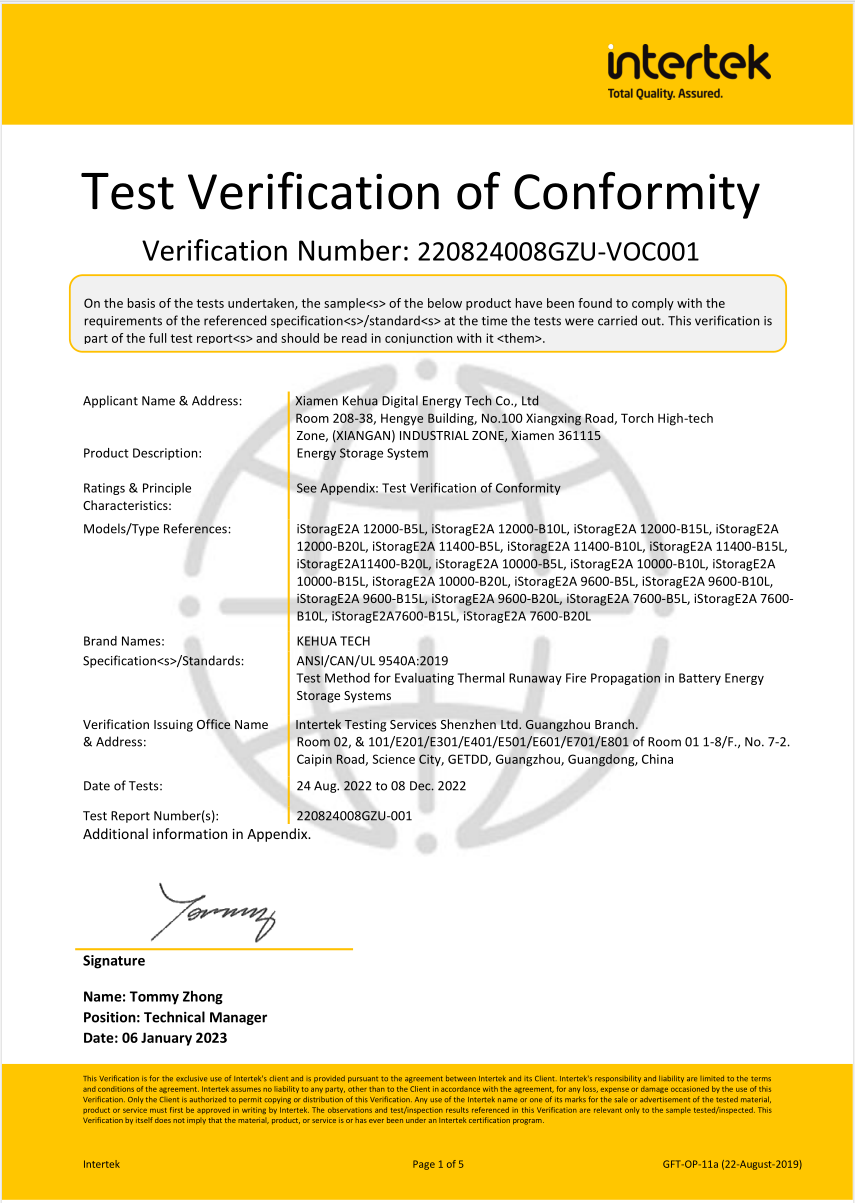 近日,廈門科華數能(néng)科技有限公司(簡稱“科華數能(néng)”)iStoragE2A系列戶用儲能(néng)解決方案産品順利通過 UL9540、UL9540A、UL1973、UL1741、UL1998等系列安全測試,獲得Intertek天祥集團(以下(xià)簡稱“Intertek”)授予認證證書,為(wèi)科華數能(néng)産品順利進軍國際市(shì)場拿厭(chǎng)提供強有力保障。