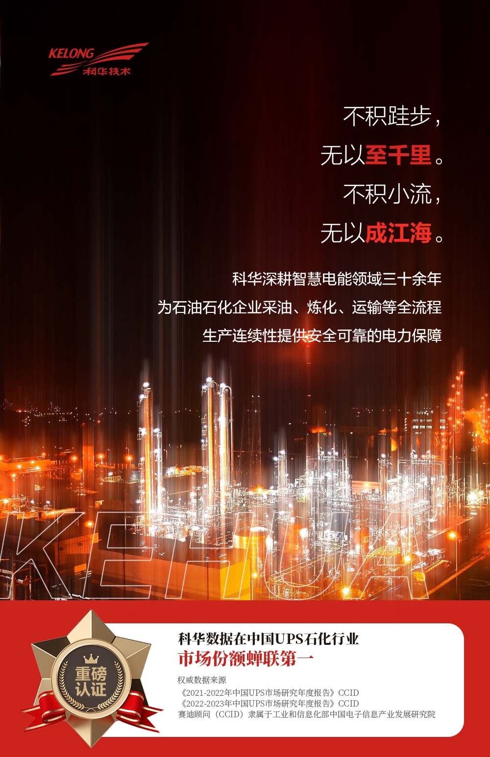 據賽迪顧問(CCID)《2021-2022年中國UPS市(shì)場(chǎn我暗g)研究年度報(bào)告》及《2022-2做照023年中國UPS市(shì)場(chǎng)研究年度不到報(bào)告》顯示,科華數據在中國UPS石化(huà)行業市(會去shì)場(chǎng)份額蟬聯第一(yī)。榮譽背和舊後是積年累月(yuè)(yuè)的沉澱,是持續創新(xīn)的迸發師弟,是追求卓越的綻放(fàng)。